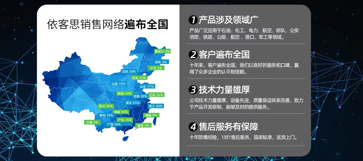 依客思防爆專注于防爆產(chǎn)品的研發(fā)、生產(chǎn)與銷售,主要產(chǎn)品有:防爆操作柱、BXCQ防爆靜電釋放儀、BZC系列防爆操作柱、不銹鋼現(xiàn)場操作箱、BXM(D)防爆照明(動力)配電箱、BXX防爆檢修箱、BXJ防爆接線箱、LED防爆燈、防爆管件、防爆風(fēng)機等產(chǎn)品,型號規(guī)格齊全,廣泛適用于煤炭、電力、醫(yī)藥、石油、化工、航空等領(lǐng)域。我公司產(chǎn)品質(zhì)量過硬,價格實惠,銷售范圍廣,且與各大型企業(yè)建立了良好的合作關(guān)系,同時還遠銷中、東亞和北美等地區(qū),深受用戶喜愛與青睞。